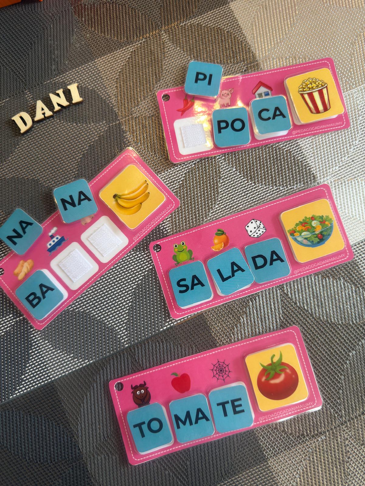 A criança observa as imagens apresentadas como pistas e utiliza as sílabas disponíveis para formar a palavra correspondente. Em seguida, organiza as sílabas nos espaços indicados, desenvolvendo a associação entre imagem, som e escrita.